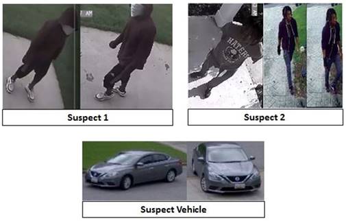 Suspect 1: Black male wearing a maroon hoodie, white mask, Adidas shorts, and Nike Air Max 97’s.