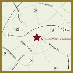 From Atlanta: Take I-85 North to GA-316, exit towards Lawrenceville/Athens. Take Exit 5, turning right onto GA-120 towards Lawrenceville. Continue 1.6 miles on to West Crogan Street. The Courthouse is on the left.
