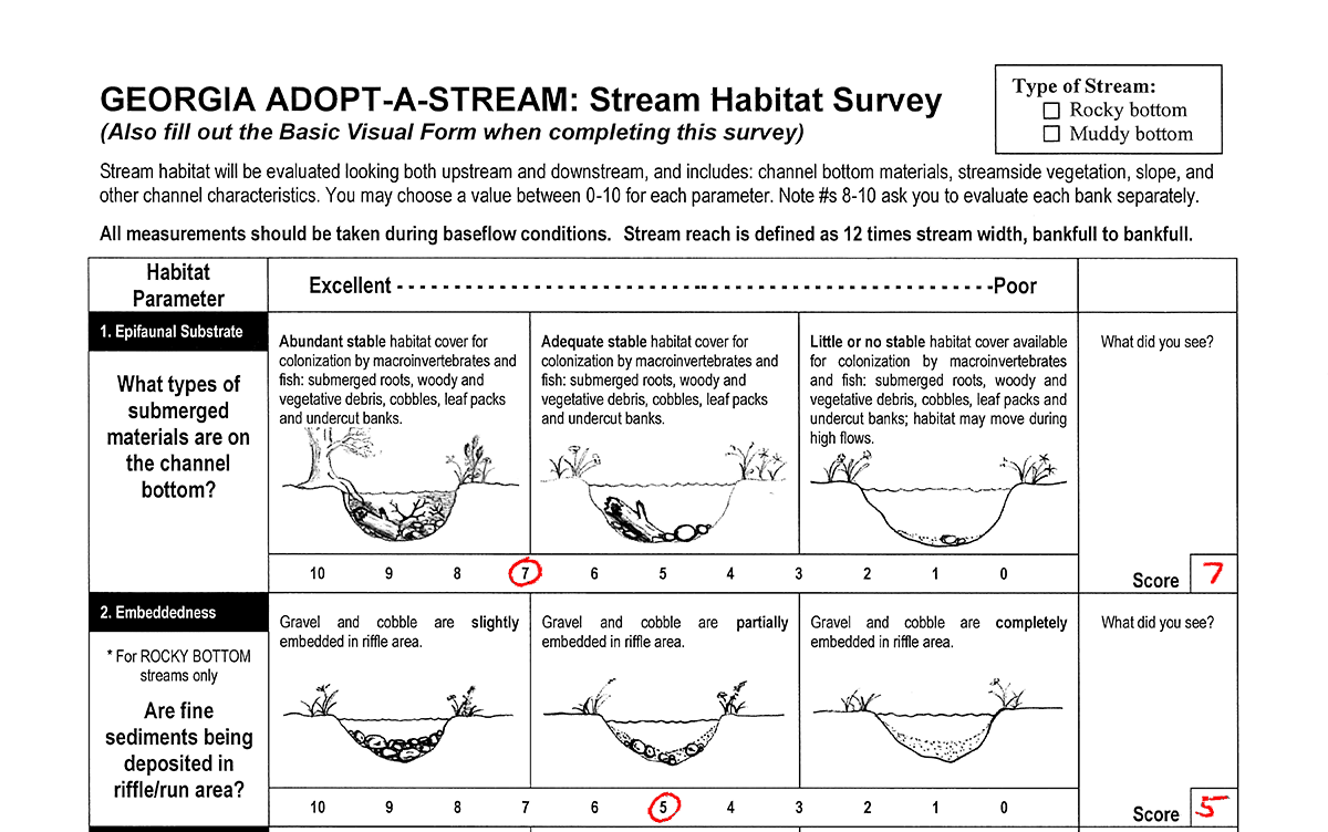 To understand how human activities impact habitat for wildlife, the Georgia Adopt-a-Stream Habitat Survey will allow you to score and compare these streams to determine their health status. While it is always best to go outside and explore nature, this activity can be done in the classroom or at home!